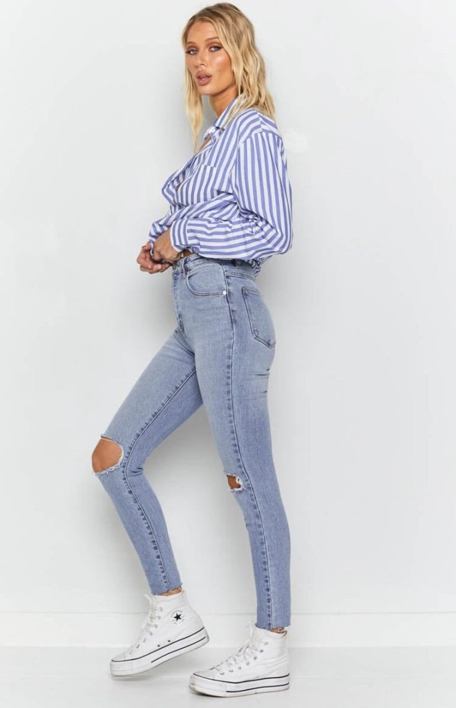 There’s nothing more classic than a white button-up, and paired with a distressed pair of skinny jeans.