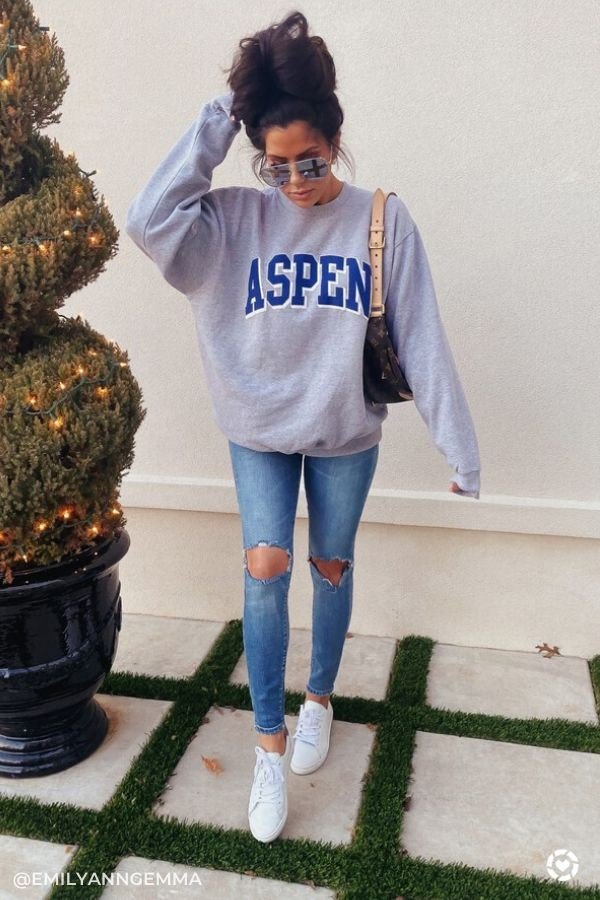 As far as transitional looks go, there’s nothing quite like a sweatshirt-and-jeans combo. To make a sweater work with your skinny jeans, go for an oversized fit or a couple of sizes larger than your usual size.