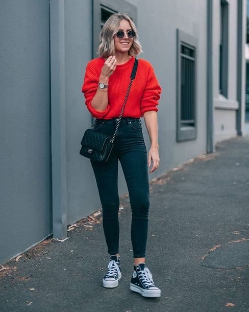 A chunkier and cropped sweater is very cool with skinnies paired with sneakers will inject an extra dose of polish into the look.