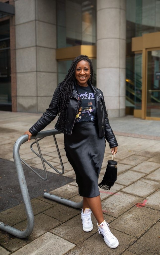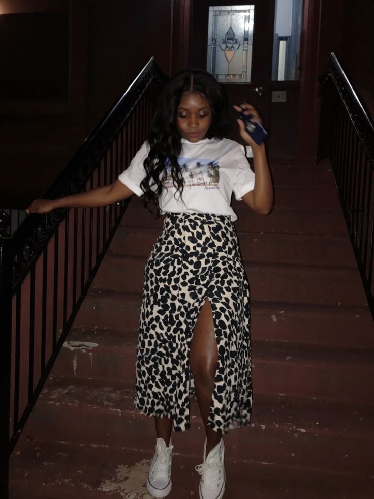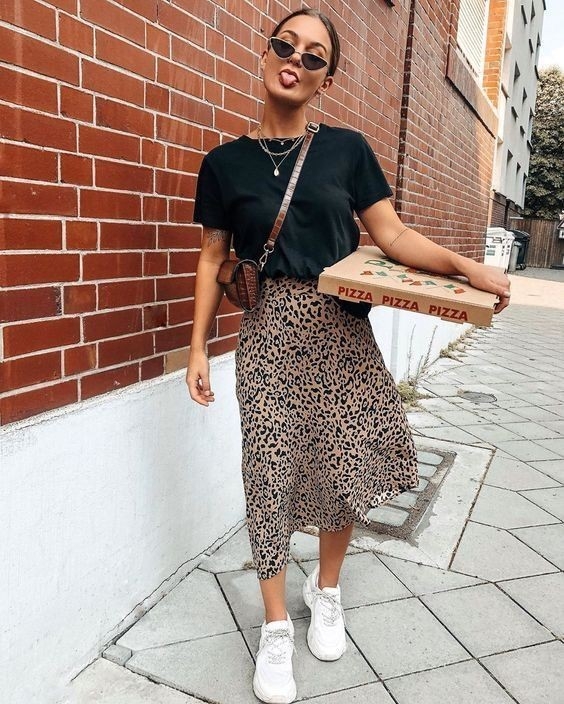 Midi skirts+ leather jacket gives an edgy and cool vibe for a date night or dinner with friends and it brings cool points to your entire look. Pair your animal print midi skirt with a plain top and a black leather jacket.
