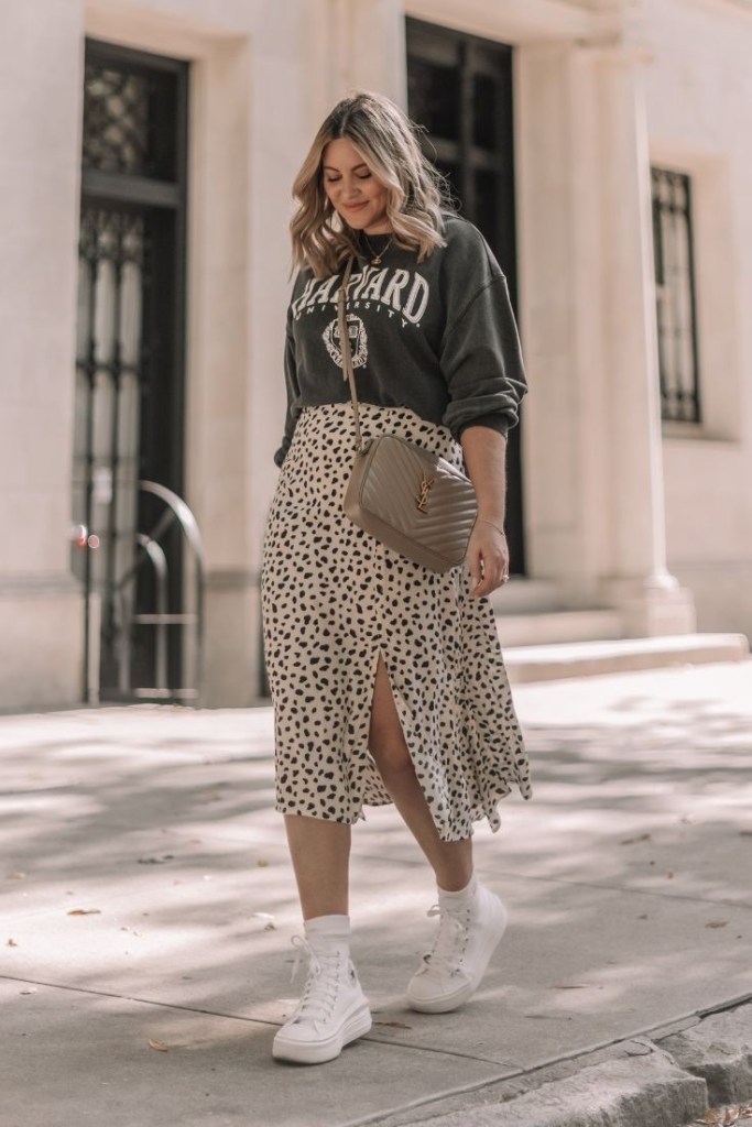 Midi skirt is a perfect piece to pair with a sweatshirt, just add sneakers and you’re good. Opt for a slit midi skirt
