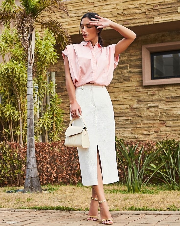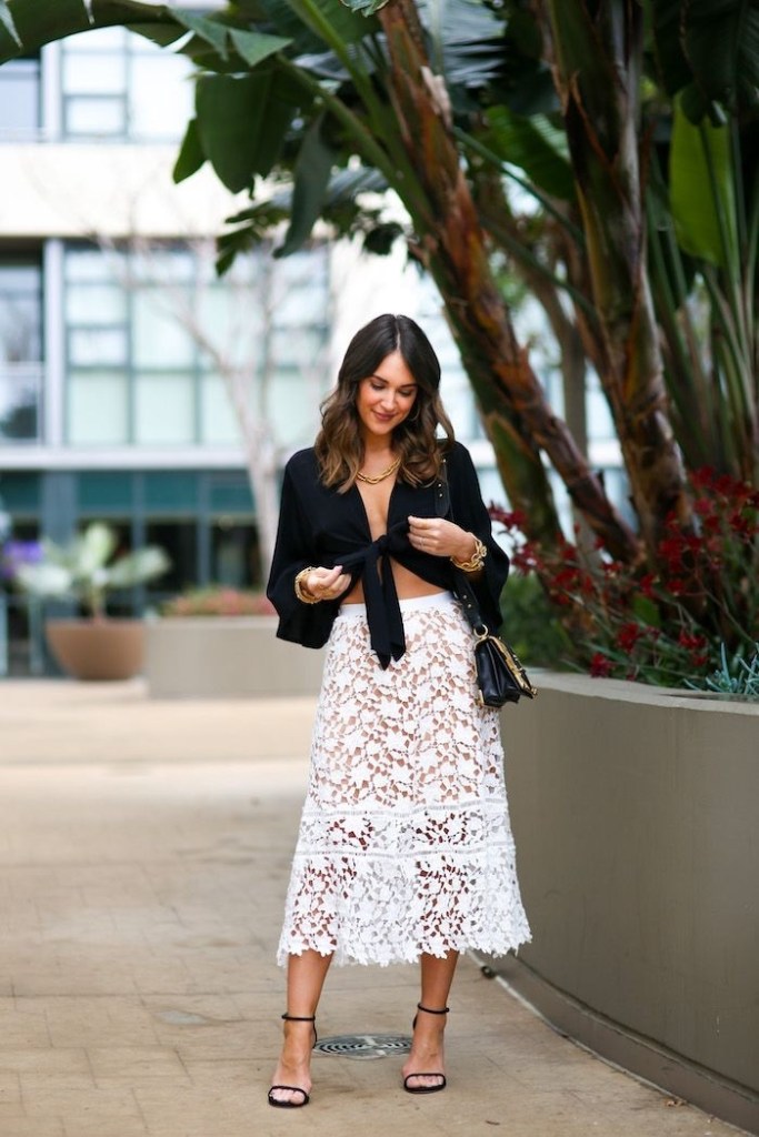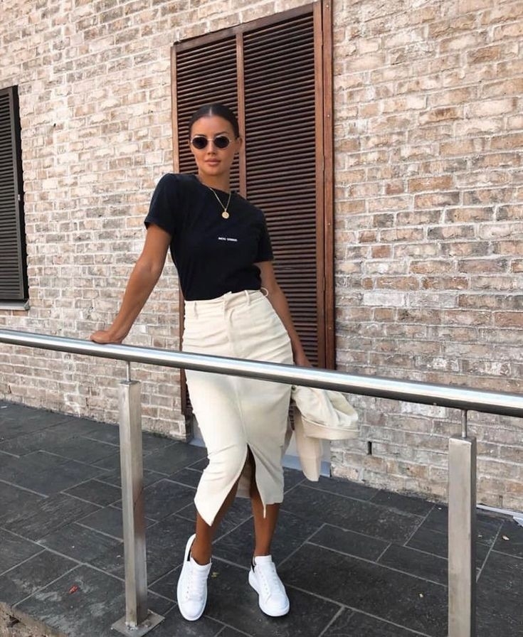 Midis also pair nicely with T-shirts for a relaxed vibe.This is a great outfit and the perfect choice for running errands or meeting friends for coffee.Complete your casual look with a pair of white sneakers.