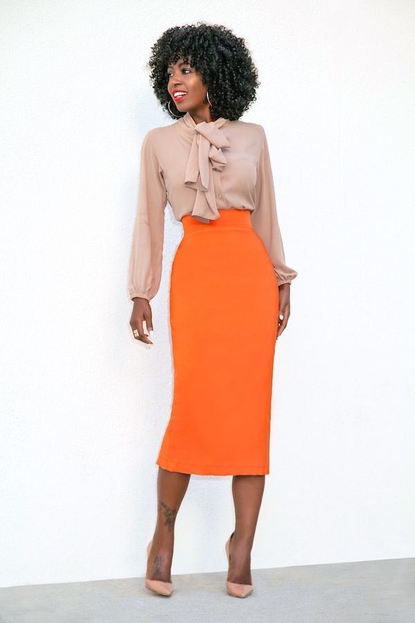 Dress up your skirt with a silk blouse or any fabric with a good drape so it doesn’t add bulk.Pair with pointy stilettos to make the look more business-casual and stylish.