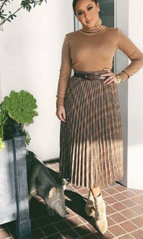 On a chilly day,go for an oversized sweater with your pleated midi skirt.Add a pair of combat boots to finish off the look.